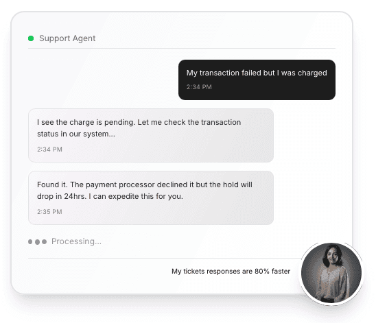 Handles customer inquiries and resolves account issues in real-time. Accesses your CRM, transaction history, and knowledge base to provide accurate answers without escalation for routine questions.
